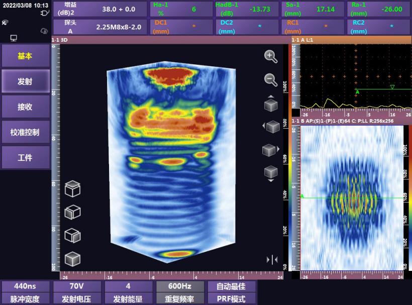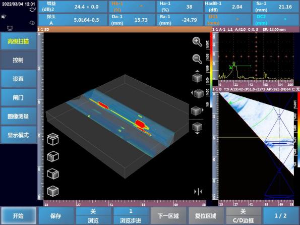 内置3D图像处理引擎实现一维探头的3D工艺仿真和成像检测:支持工件、探头、楔块、声束传播路径的3D显示,提高检测工艺制定的准确性;通过实时将B图像转换为3D数据,实现3D成像检测,检测缺陷显示更加直观完整。