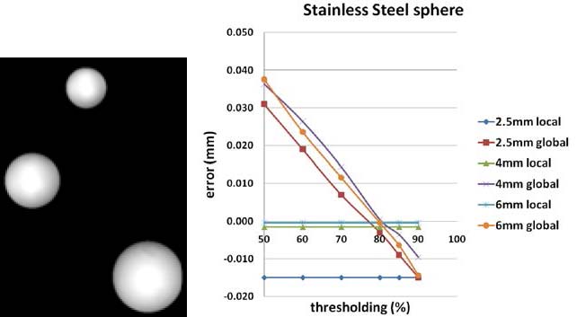 在许多情况下,局部自适应阈值方法导致更好的精度相比,50%的等值面全局阈值法。然而,等值面转移至更低或更高的灰度值(图1a)时,精度的改进可以被检测,如在图4中示出。 3个不锈钢球(直径:2.5mm,4毫米,6毫米,保证公差+ / - 2微米)一起在一个设置扫描范围。上的直径的偏差分段CT模型减去标称尺寸(测量值)作为阈值的值的函数作图。该图表明,局部阈值比全球50%的阈值给出更精确的结果。然而,通过适应的灰度值直方图中的等值面,测量误差可以降低到±3在约m的,如果被选择的灰度值的等值面。在直方图中的80%。在这种情况下,这是类似的,或什至更好的局部阈值的比对结果。图上的线之间的距离。图4是,然而,依赖于对象,设置和机械特性。