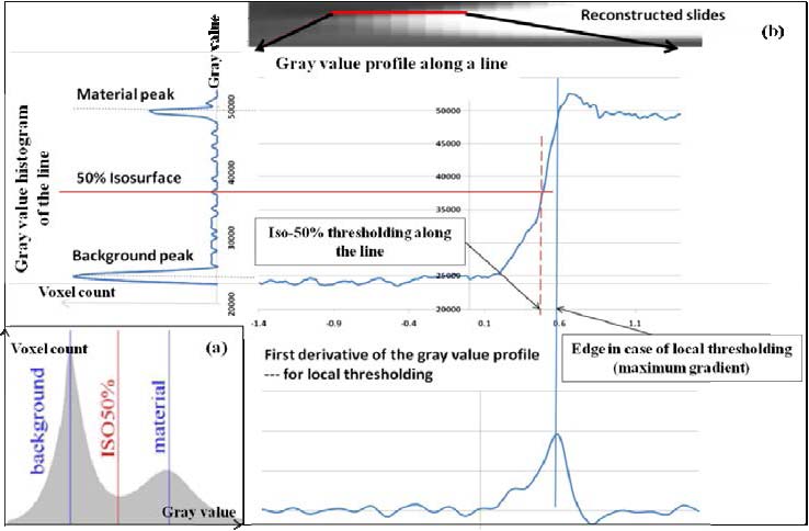 线交叉的重建滑动的气缸的灰度值的档案。很明显,实际材料边缘位于内的第1体素的灰度值开始迅速增加。对于其他三个铝瓶,已经发现了类似的结果。